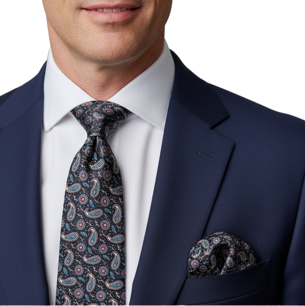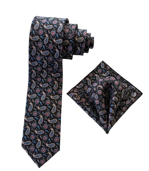 Crafted from 100% silk, this paisley-patterned tie features a striking combination of blue and red on a black background. The set includes a coordinating pocket square, perfectly designed to elevate your formal look.