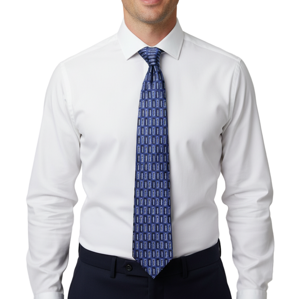 Crafted from 100% Italian silk, this blue geometric-patterned tie showcases a vibrant blend of purplish blue, light blue, and white. It’s expertly designed to elevate your formal attire with a sophisticated touch.