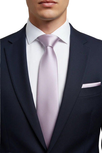 Man wearing a navy suit with a crisp white shirt, Blush Tie and pocket square.