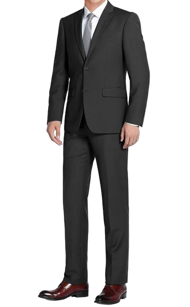 This sleek black 2-piece suit delivers sharp style with a tailored slim fit. The two-button jacket and streamlined cut create a polished, modern look that works for any occasion. Quality construction ensures durability. Dry clean only. Make a confident impression with timeless sophistication.
