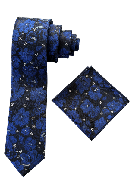 Made from pure silk, this blue floral tie showcases a bold blend of blue against a sleek black base. Included is a matching pocket square, expertly crafted to enhance your formal attire with a refined touch.